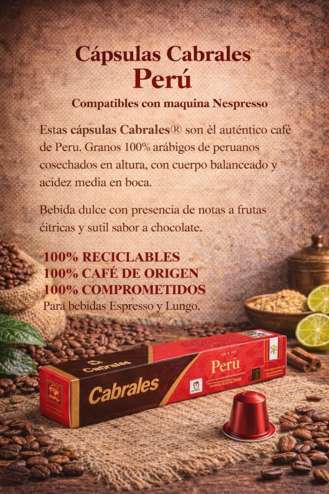 Estas cápsulas Cabrales® son él auténtico café de Perú. Granos 100% arábigos de peruanos cosechados en altura, con cuerpo balanceado y acidez media en boca.